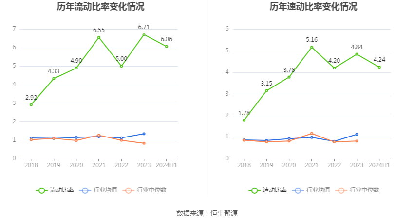 2024年上半年,公司流动比率为6.06,速动比率为4.24。