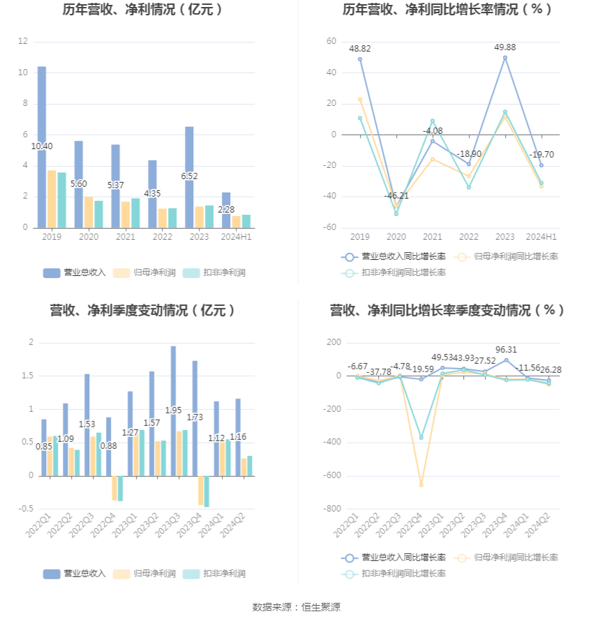 根据半年报,公司第二季度实现营业总收入1.16亿元,同比下降26.28%,环比增长3.03%;归母净利润2551.07万元,同比下降50.73%,环比下降49.92%;扣非净利润2955.94万元,同比下降44.14%,环比下降45.90%。