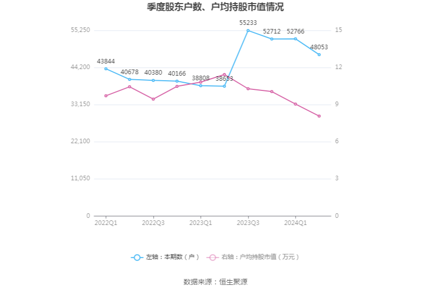 筹码集中度方面,截至2024年上半年末,公司股东总户数为4.81万户,较一季度末下降了4713户,降幅8.93%;户均持股市值由一季度末的9.05万元下降至8.08万元,降幅为10.72%。