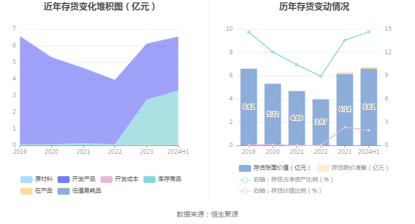 从存货变动来看,截至2024年上半年末,公司存货账面价值为6.61亿元,占净资产的14.66%,较上年末增加4665.16万元。其中,存货跌价准备为1329.01万元,计提比例为1.97%。