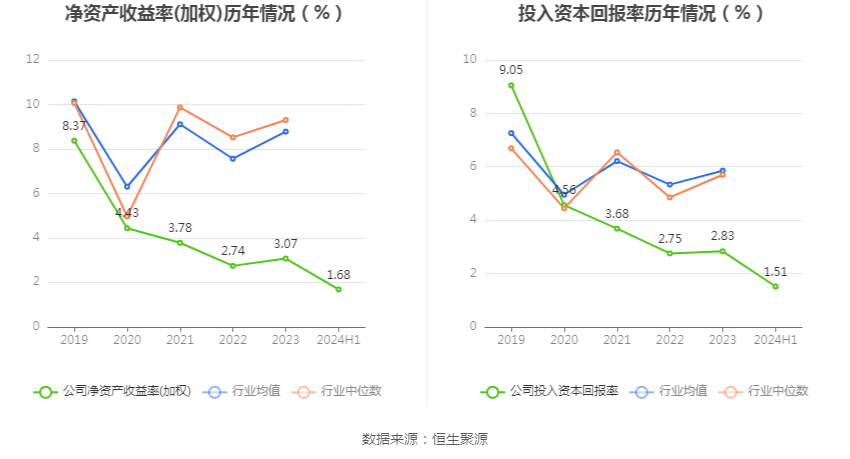 数据显示,2024年上半年公司加权平均净资产收益率为1.68%,较上年同期下降0.82个百分点;公司2024年上半年投入资本回报率为1.51%,较上年同期下降1.06个百分点。