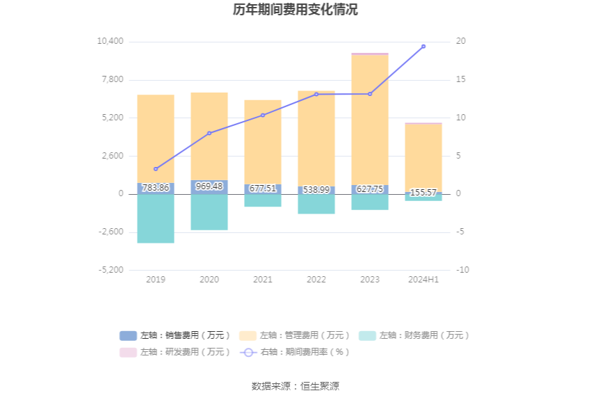 2024年上半年,公司期间费用为4421.53万元,较上年同期增加651.39万元;期间费用率为19.39%,较上年同期上升6.11个百分点。其中,销售费用同比下降52.59%,管理费用同比增长21.22%,研发费用同比下降12.97%,财务费用由去年同期的-483.64万元变为-452.69万元。