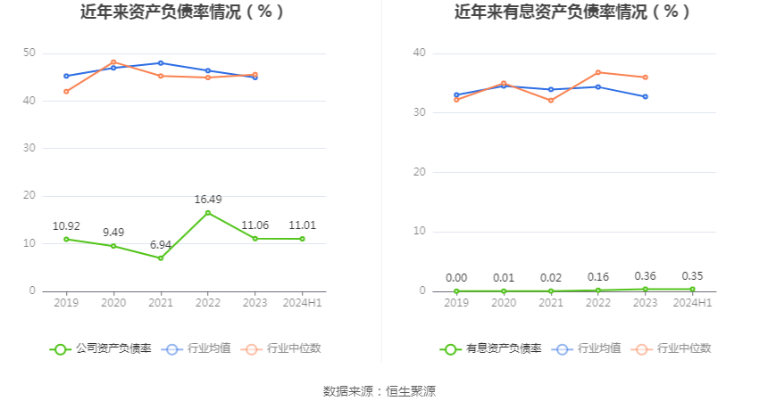 在偿债能力方面,公司2024年上半年末资产负债率为11.01%,相比上年末下降0.05个百分点;有息资产负债率为0.35%,相比上年末下降0.01个百分点。