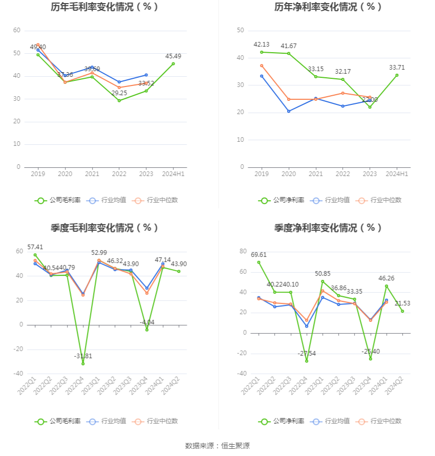 2024年上半年,公司毛利率为45.49%,同比下降3.81个百分点;净利率为33.71%,较上年同期下降9.41个百分点。从单季度指标来看,2024年第二季度公司毛利率为43.90%,同比下降2.42个百分点,环比下降3.24个百分点;净利率为21.53%,较上年同期下降15.33个百分点,较上一季度下降24.73个百分点。