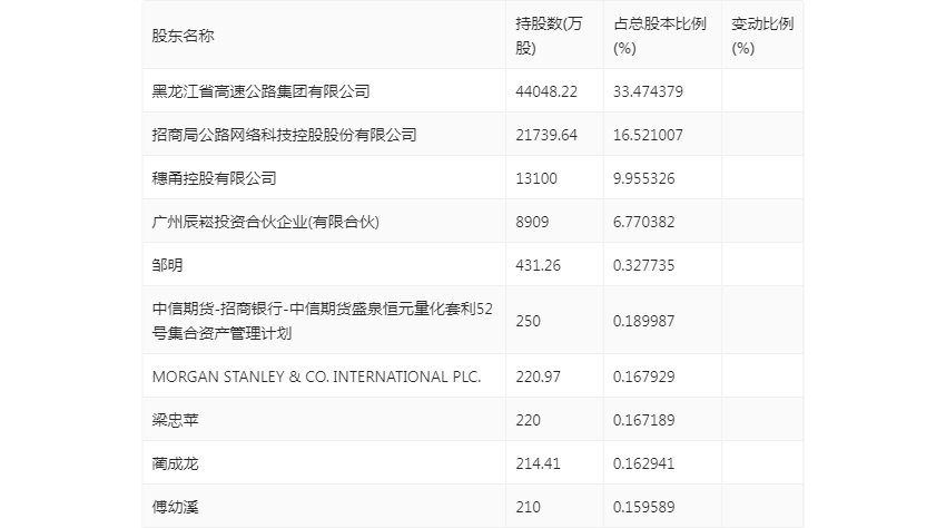 半年报显示,2024年上半年末公司十大流通股东中,新进股东为中信期货-招商银行-中信期货盛泉恒元量化套利52号集合资产管理计划、MORGAN STANLEY & CO. INTERNATIONAL PLC.、梁忠苹、傅幼溪,取代了一季度末的黑龙江交通发展股份有限公司回购专用证券账户、天铖致远1号私募证券投资基金、陶伟冬、陈宏。在具体持股比例上,蔺成龙持股有所上升,穗甬控股有限公司、广州辰崧投资合伙企业(有限合伙)持股有所下降。