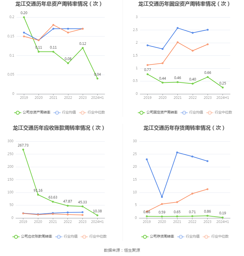 营运能力方面,2024年上半年,公司公司总资产周转率为0.04次,上年同期为0.05次(2023年上半年行业平均值为0.08次,公司位居同行业16/19);固定资产周转率为0.25次,上年同期为0.28次(2023年上半年行业平均值为1.05次,公司位居同行业13/19);公司应收账款周转率、存货周转率分别为10.38次、0.19次。