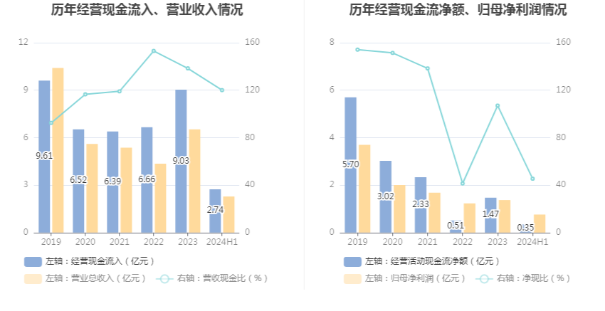 2024年上半年,公司营业收入现金比为120.03%,净现比为45.38%。
