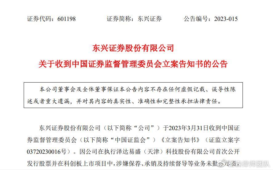 2023年4月1日,东兴证券股份有限公司(简称“公司”或者“东兴证券”)公告称收到中国证监会的《立案告知书》。