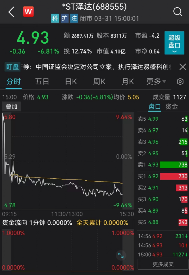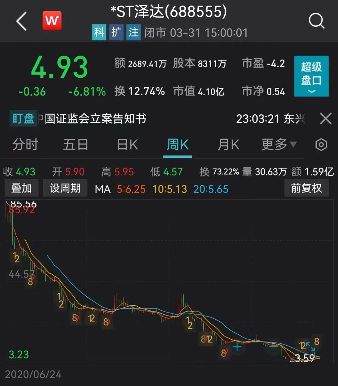 2020年6月,泽达易盛登陆科创板市场,上市初期股价曾达到85.56元/股的高位。此后,泽达易盛股价一路下行,在遭遇证监会调查及下发行政处罚事先告知书等时期,更是连拉“20CM”跌停。至今,“披星戴帽”的*ST泽达总市值仅余4.1亿元。