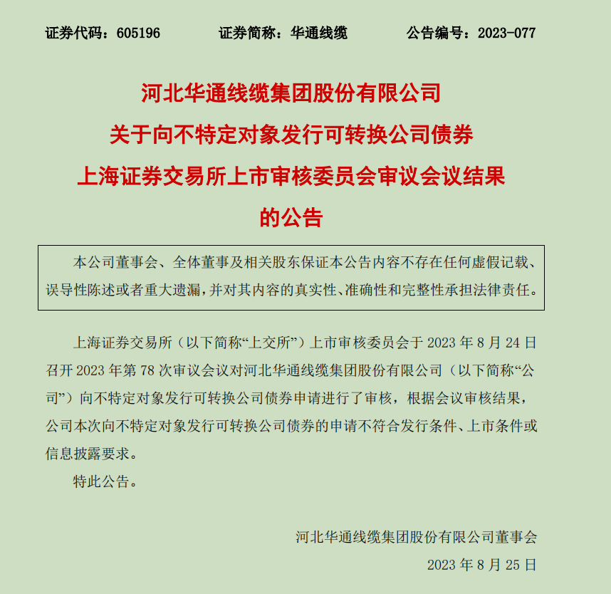 沪市主板上市公司华通线缆日前公告,上交所上市审核委员会于2023年8月24日召开2023年第78次审议会议对公司向不特定对象发行可转换公司债券申请进行了审核,根据会议审核结果,公司本次向不特定对象发行可转换公司债券的申请不符合发行条件、上市条件或信息披露要求。