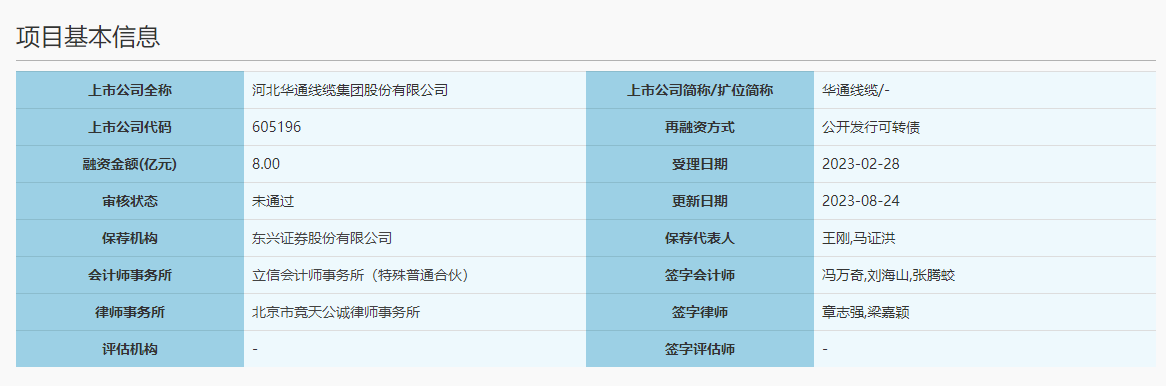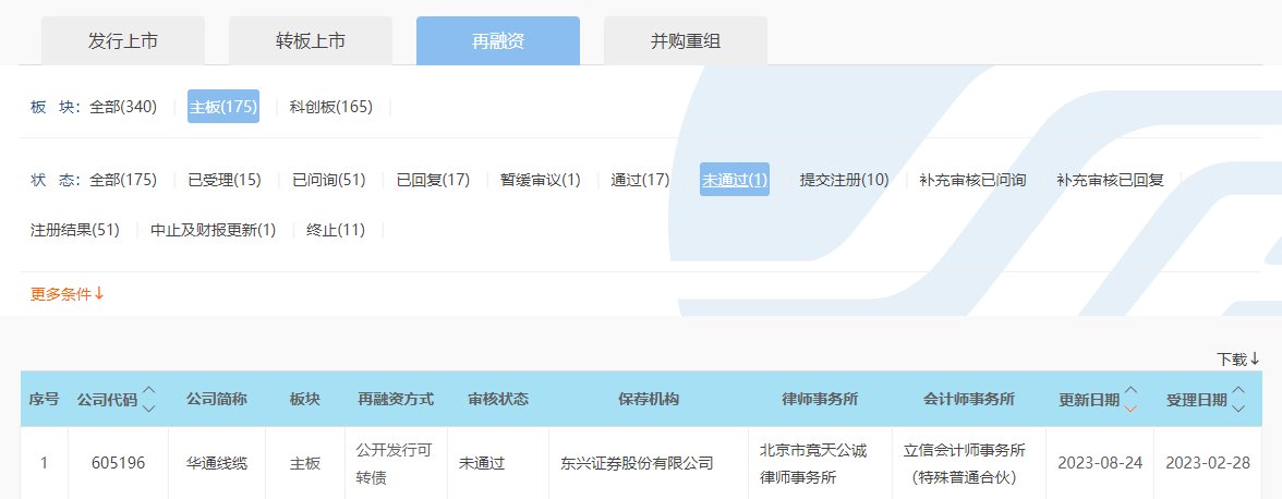 日前,华通线缆公告称,上交所上市审核委员会于2023年8月24日召开2023年第78次审议会议,公司此次发行可转债的申请未获通过。这是全面注册制实施以来沪深主板再融资被否首单,此次华通线缆发行可转债的保荐机构为东兴证券。