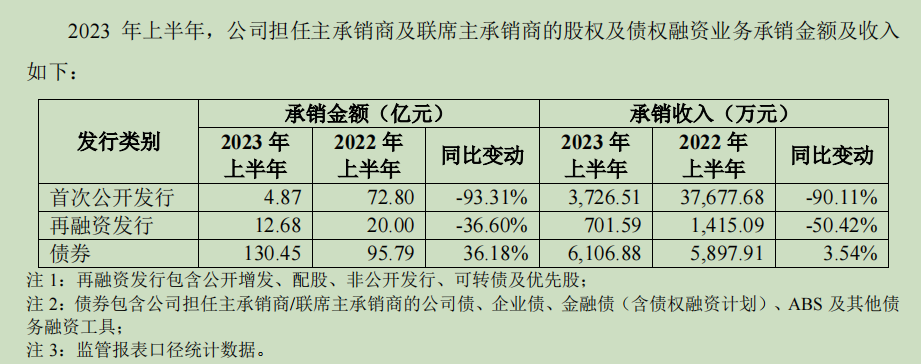 据近日公司发布的2023年中报显示,今年上半年东兴证券无论是首发还是再融资的承销金额、承销收入同比都出现大幅下降。其中首发承销金额、承销收入同比下滑的幅度都超过了90%,下滑幅度远超行业整体水平。而债券承销收入的同比小幅增长也不足以弥补股权项目收入大幅下降带来的“缺口”。