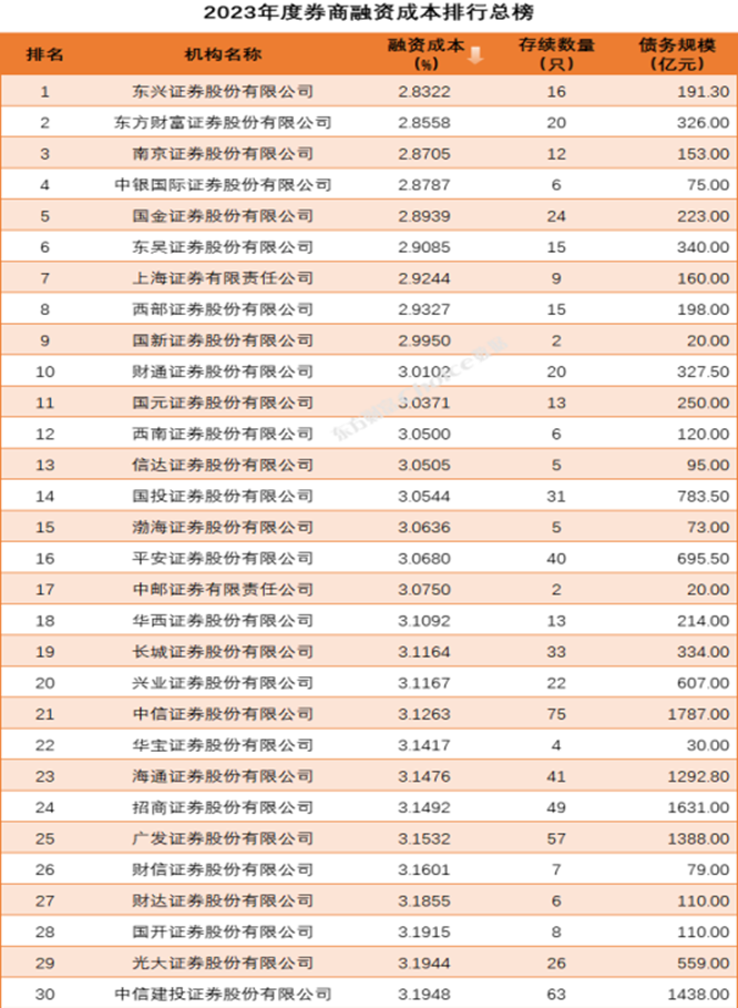 2023年12月31日,东方财富金融数据平台对2023年度证券公司发债融资情况进行梳理统计。截至2023年末,国内证券公司累计发行债券786只,同比增长37.89%,发行金额合计14,996亿,同比增长35.13%。东兴证券凭借良好的资信水平与融资能力,以2.83%的融资利率荣膺行业第一,成为2023年度发债融资成本最低券商。该项成绩的取得,充分展现了公司作为境内首家资产管理公司系上市证券公司,在融资定价、融资销售等方面的专业优势。