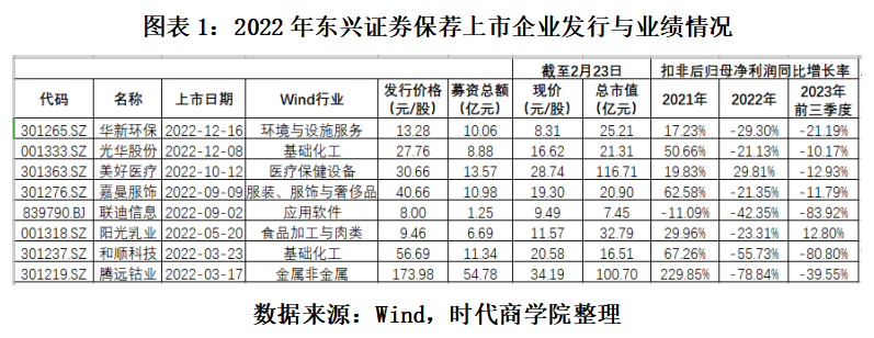而券商等中介机构作为资本市场的“看门人”,上市公司的质量高低与其在保荐工作中是否勤勉尽责密切相关。从部分IPO公司上市之后的业绩表现来看,近年来,东兴证券的保荐质量值得商榷。