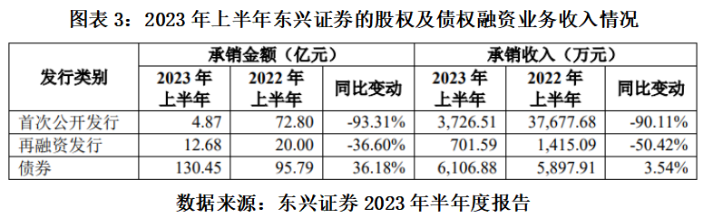 其中,IPO业务收入降幅最大。财报显示,2023年上半年,东兴证券担任主承销商及联席主承销商的IPO业务承销金额、承销收入分别为4.87亿元、3726.51万元,同比分别大幅减少93.31%、90.11%。