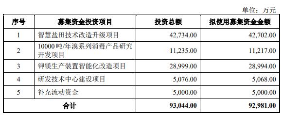 金盛海洋原拟在上交所主板公开发行股份数量不超过3,334.00万股,占发行后公司总股本的比例不低于25.00%。公司原拟募集资金9.3亿元,用于智慧盐田技术改造升级项目、10000吨/年溴系列消毒产品研究开发项目、钾镁生产装置智能化改造项目、研发技术中心建设项目、补充流动资金。