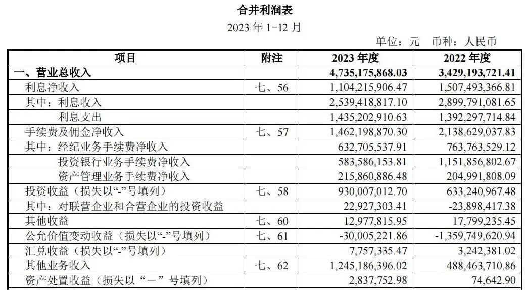 东兴证券2023年营业收入同比增38.08%,归属于母公司股东的净利润同比增58.50%。该公司当年业绩增长主要因自营业务中的投资收益与公允价值变动收益合计额同比大幅增长,而利息净收入、手续费及佣金净收入这两项主营收入则同比下降。手续费及佣金净收入中,投资银行业务手续费净收入同比减少5.68亿元,同比降49.31%,在各主要营收项中减少金额和降幅最大。