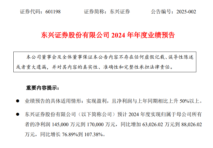 《电鳗财经》关注到,2024年1月6日,东兴证券发布业绩预告,预计2024年度实现归母净利润14.5亿元到17亿元,与上年同期相比增长76.89%到107.38%。东兴证券在公告中表示,2024 年,我国经济在复杂严峻形势下保持总体平稳、稳中有进,高质量发展扎实推进。公司聚焦战略落地,进一步打磨差异化特色,坚守绝对收益理念,积极推动各项业务稳健发展。报告期内,公司投资业绩大幅增长,财富业务及资产管理业务稳步发展,实现公司整体经营业绩同比大幅提升。