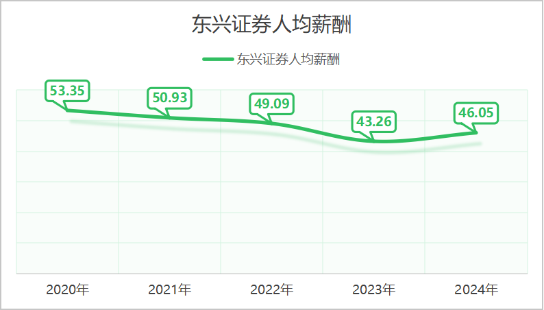 年报显示,截至2024年末,东兴证券员工总数为2670人,同比减少5%。现金流量表中“支付给职工及为职工支付的现金”数额为12.2亿元,再参考应付职工薪酬,《财中社》计算得出东兴证券2024年人均薪资46.05万元,同比增长6.46%。