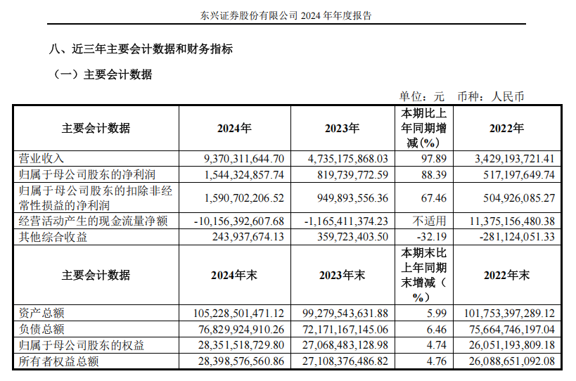 4月3日下午,东兴证券(601198)发布2024年年度报告:公司现营业收入93.7亿元,同比增长97.9%,实母净利润15.4亿元,同比增加88.4%。
