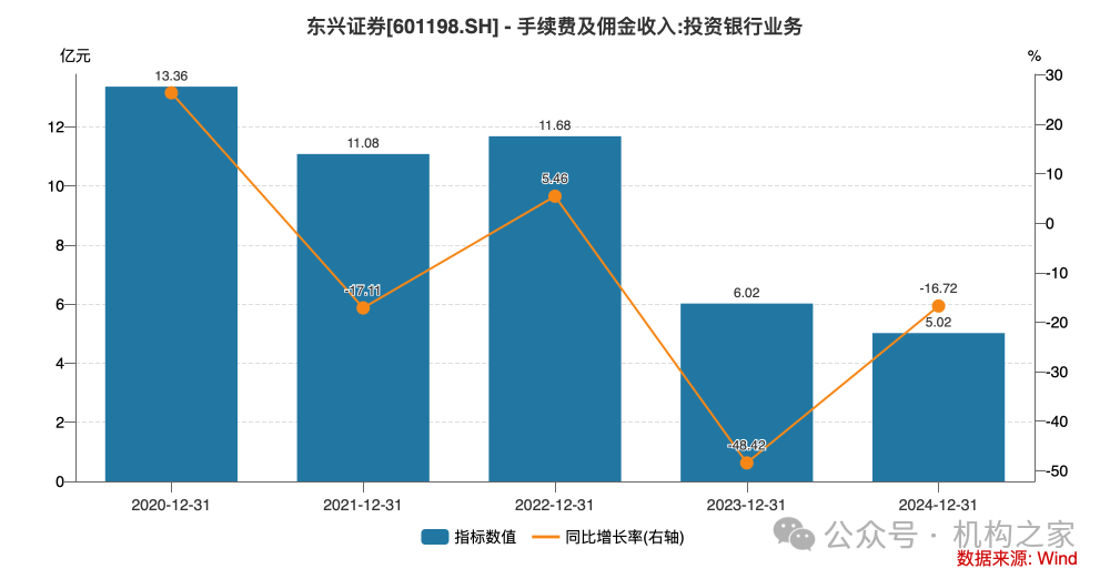 进一步拆解员工构成数据可以更直观地看出东兴证券近年来在内部资源配置上的战略调整方向。Wind数据显示,2024年末,东兴证券投行业务人员缩减至271人,较2022年末减少逾百人;资产管理条线则从2020年末的162人持续收缩至2024年末的77人,压缩幅度超过50%。尤为值得关注的是,研究条线人员从2020年末的111人降至2024年末的62人,五年间减幅接近50%。反映出公司对部分业务板块执行了相对激进的人力“瘦身”策略。
