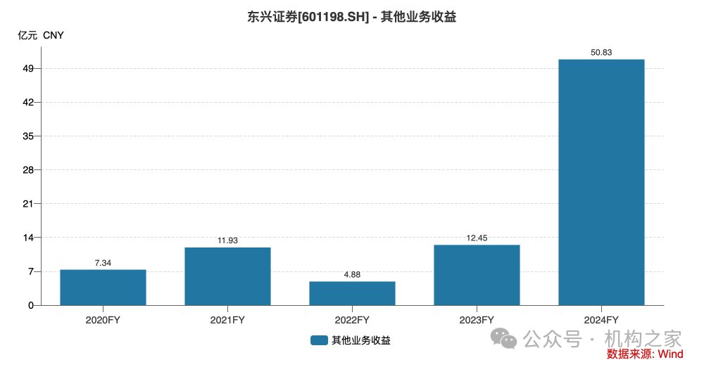 整体来看,东兴证券2024年营业收入同比增加46.35亿元,其中“其他业务收入”贡献了38.38亿元,增量占比高达83%,成为拉动营收增长的绝对主力。然而,该板块虽推动收入大幅扩张,却未能实现实际利润,对公司盈利无正向贡献。