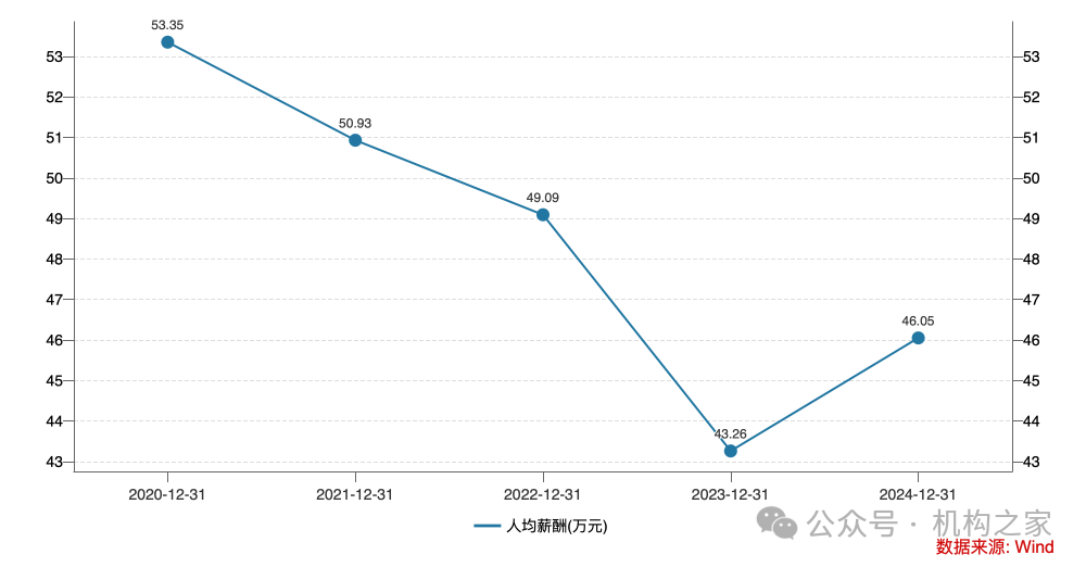 Wind数据显示,2024年末,公司员工总数降至2,670人,较2022年减少14.53%,为近五年来最低点。员工薪酬总额为12.62亿元,同比下降1.7%,较2020年高点(15.85亿元)则减少约20%。与此同时,人均薪酬为46.05万元,较2023年回升6.5%,但依然低于2020-2022年的水平。