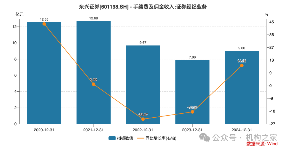 在经历连续两年下滑之后,东兴证券的证券经纪业务于2024年实现温和回升。Wind数据显示,该板块全年收入达9亿元,同比增长14.20%。其中,代理买卖证券业务收入为8.42亿元,同比增长23%,成为推动增长的核心动力。相较之下,代销金融产品与交易单元席位租赁收入分别为0.45亿元和0.13亿元,同比下降6.30%与76.43%,反映出公司在财富管理服务能力和研究所赋能方面相对薄弱。