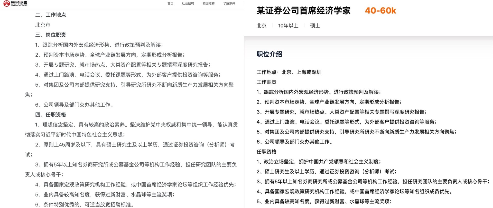 值得关注的是,东兴证券此次公开招聘公告中未提及首席经济学家岗位的具体薪酬。不过记者在招聘网站上发现一则“某证券公司首席经济学家”的招聘信息,其标注的薪酬范围为40k-60k,且该岗位的工作职责与任职资格要求,与东兴证券此次招聘内容高度重合。