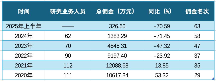 值得注意的是,自2019年原首席经济学家张岸元离职后,东兴证券首席经济学家一职已空缺多年,且近年来其研究所发展不容乐观,研究业务人员从2020年的111人逐年下滑至2024年的62人,分仓佣金收入更是从2020年的1.06亿元跌至2024年的1383.29万元,2025年上半年同比再下滑70.59%。此外,今年以来券商首席经济学家变动频繁,多家券商都出现了首席经济学家的任职或离职情况。
