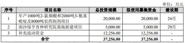 绿亨科技拟募集资金37,256.00万元,按轻重缓急顺序投入“年产1000吨2-氯烟酸和2000吨3-氰基吡啶及8000吨农药制剂项目”、“南沙绿亨育种研究院基地新建项目”和“补充流动资金”。