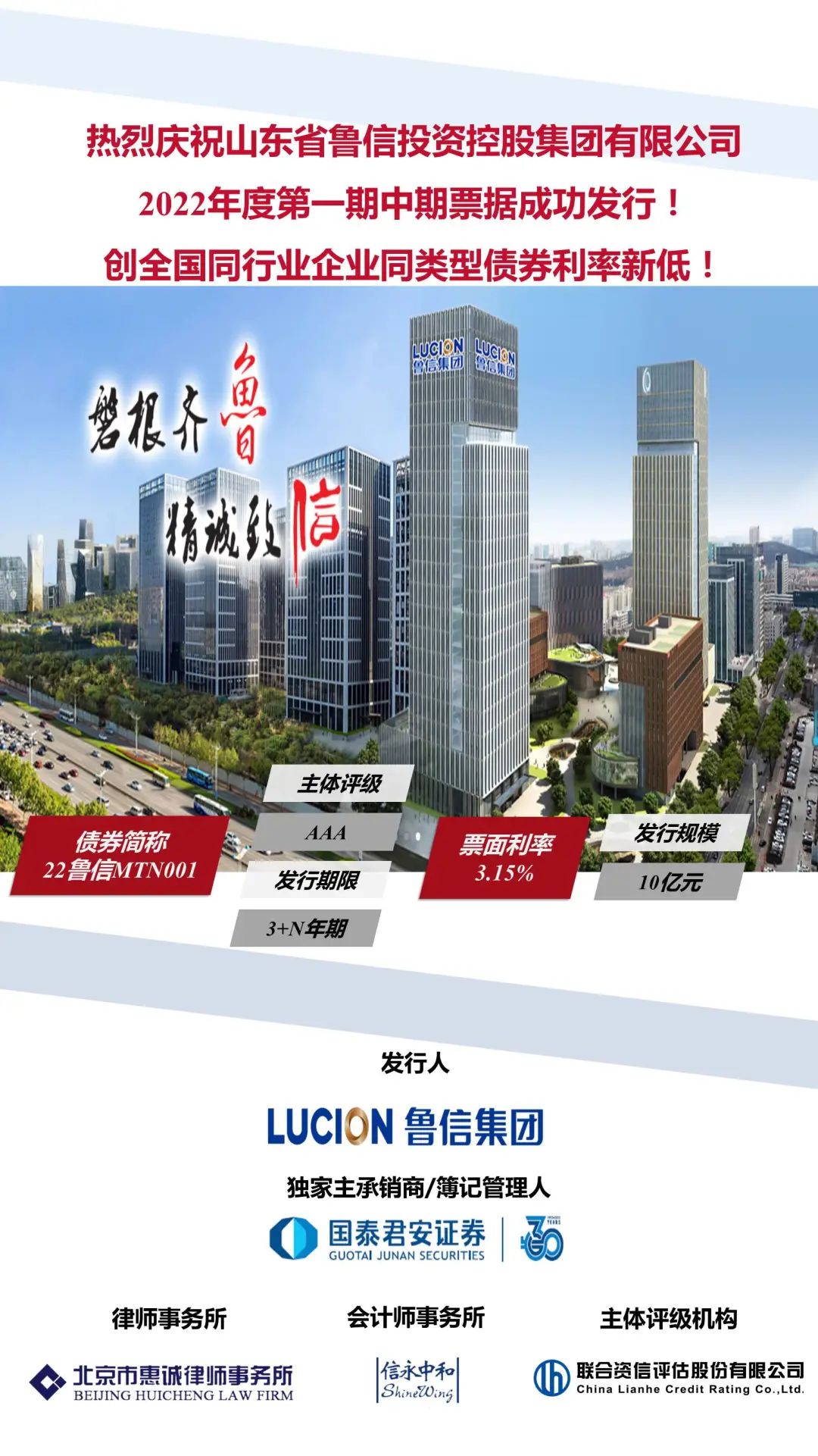 9月28日,由国泰君安独立主承销的山东省鲁信投资控股集团有限公司2022年度第一期中期票据成功发行。本次中期票据发行规模10亿元,发行期限3+N年期,票面利率3.15%,是鲁信集团首次注册储架式债务融资工具项下的首期发行,发行利率创造同行业企业同类型债券新低。