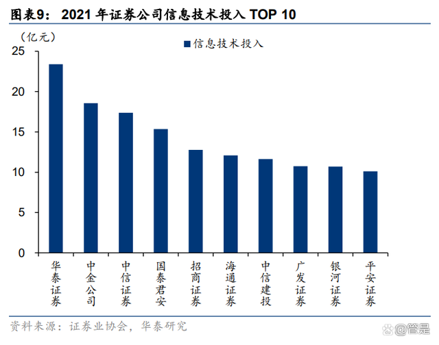 不断加大金融科技领域投入,打造领先数字科技优势。公司高度重视科技领域战略投入,持续推进金融科技创新,信息技术投入始终位居行业前列。2003 年公司率先建成大规模应用的集中交易系统;2014 年建成行业首家高等级、大容量、园区型绿色数据中心。2020 年以来,证券行业与数字技术融合加速,公司先后启动集团经营管理驾驶舱、跨界金融科技实验室、新一代信创分布式核心交易系统等项目建设,引领行业数字科技发展。2021 年公司信息技术投入 15.4 亿元,同比增长 10%,排名行业第 4。