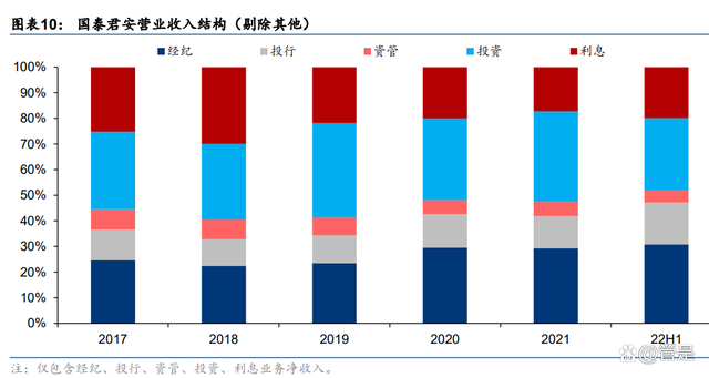 战略布局转型,业务结构调整。2020 年实施“第一个三年计划”以来,公司持续调整战略布局,稳步推进财富管理转型,经纪业务收入占比持续提升,同时把握资本市场机构化趋势,构建机构业务生态。改革以来公司业务结构变动较大,轻资产业务占比显著提升,由 2019 年的 41%增长至 2022 年上半年的 52%,22H1 公司经纪、投资、利息、投行、资管业务剔除其他业务影响后的占比分别为 31%、28%、20%、16%、5%。
