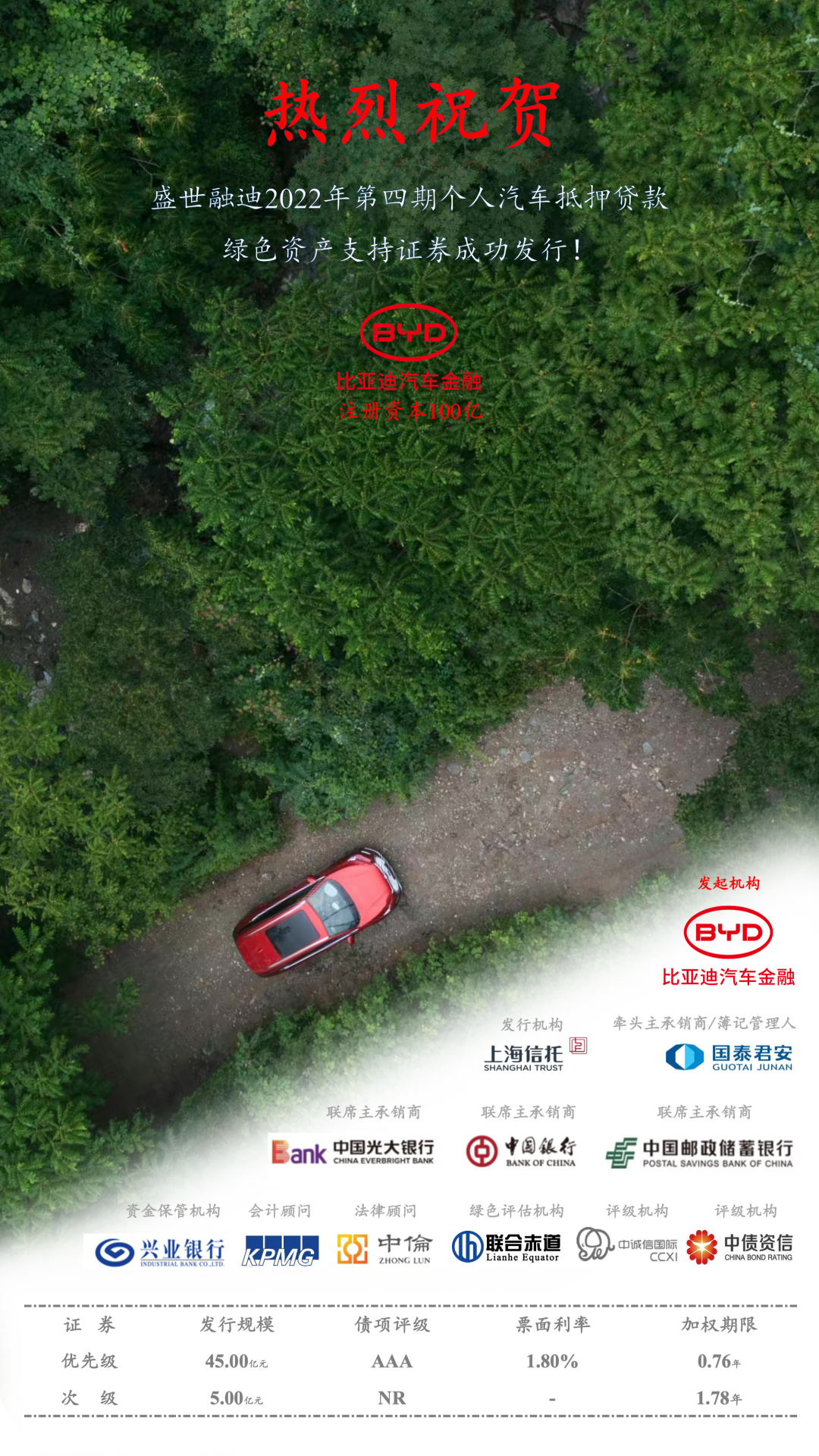 近日,国泰君安作为牵头主承销商和薄记管理人,助力比亚迪汽车金融“盛世融迪2022年第四期个人汽车抵押贷款绿色资产支持证券”(简称“盛世融迪2022-4”)在银行间债券市场成功发行。本期ABS项目是比亚迪汽车金融增资至100亿元后的首单ABS产品,也是目前票面利率最低的绿色车贷ABS产品。