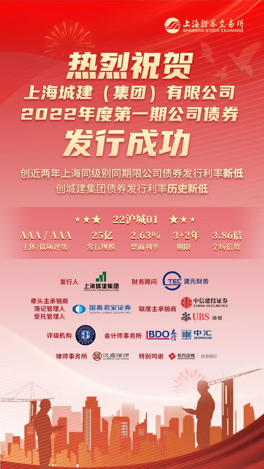 10月19日,国泰君安牵头主承销的上海城建(集团)有限公司2022年面向专业投资者公开发行公司债券(第一期)成功发行。本期债券发行规模为25亿元,票面利率2.63%,得到各类机构投资人的积极响应,认购倍数达3.86倍,吸引近百亿资金量参与认购,创近两年上海同级别同期限公司债券发行利率新低。