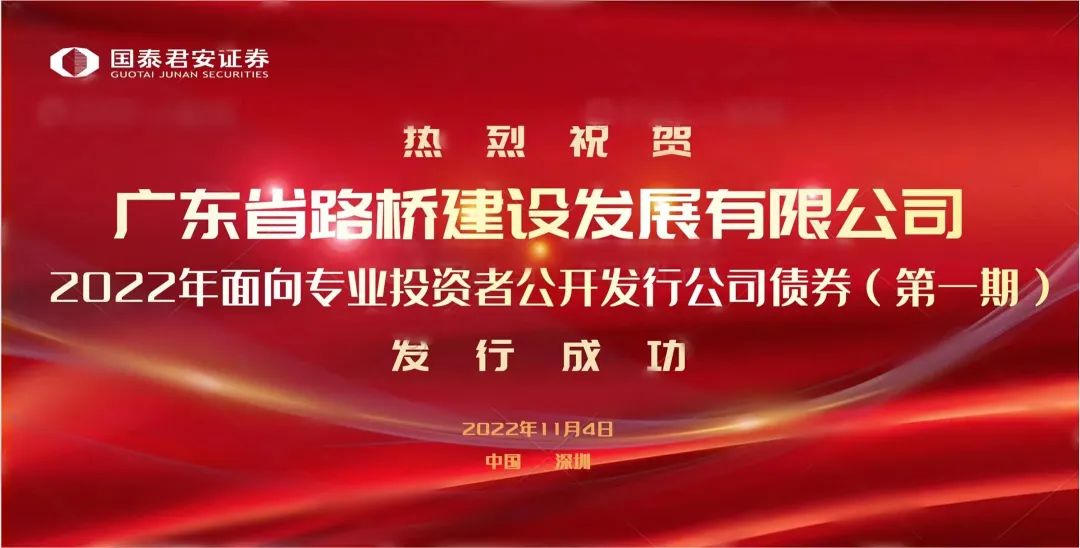 近日,国泰君安助力广东省路桥建设发展有限公司2022年面向专业投资者公开发行公司债券(第一期)成功发行,本期债券发行规模为15亿元,发行期限为5+5年。市场投资者积极参与,全场认购倍数达到了2.37倍,最终票面利率为3.05%,创近5年来同品种同期限最低票面利率,发行圆满成功。