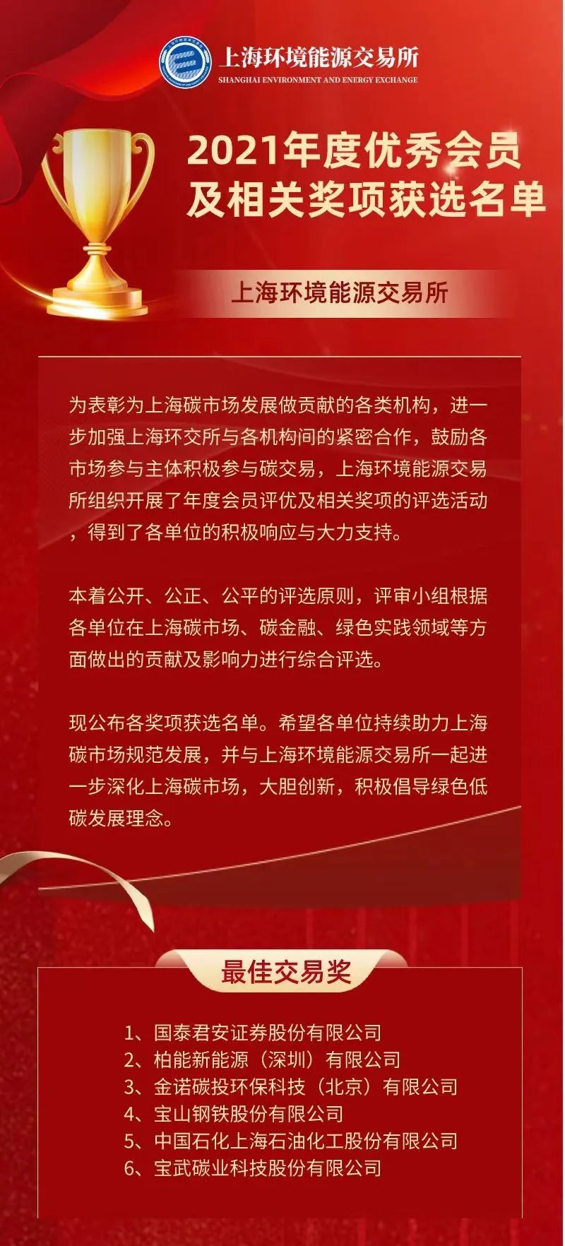 国泰君安荣获上海环境能源交易所2021年度“最佳交易奖”,连续五年获奖,是唯一斩获该奖项的证券公司