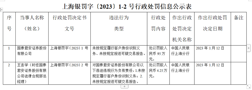 上海银罚字〔2023〕2号罚单显示,由于对国泰君安相关违法违规行为负有责任,中国人民银行上海分行对王吉学作出罚款人民币4.25万元的处罚决定。
