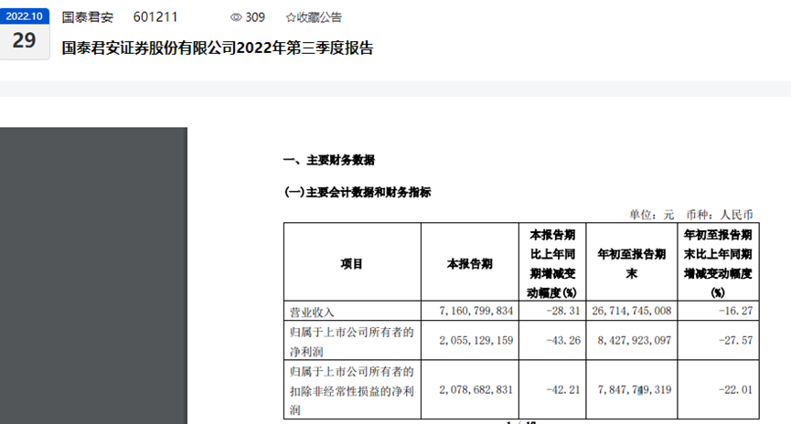 据国泰君安2022年三季报,2022年第三季度,公司营业收入71.61亿元,同比下滑28.31%,归母净利润20.55亿元,同比下滑43.26%。