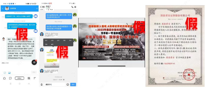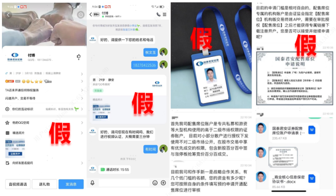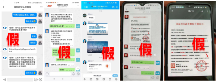 近期,国泰君安证券股份有限公司(以下简称“我司”)发现有不法分子假冒我司及工作人员名义,通过电话、微信、QQ群等渠道,引导投资者下载非法APP、点击虚假官网链接、欺骗投资者入金等,严重损害投资者合法权益,同时对我司声誉造成严重不良影响。