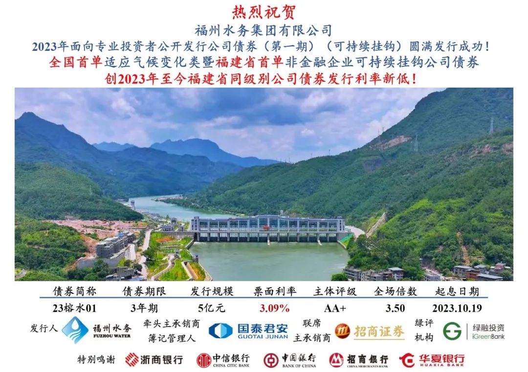 10月17日,国泰君安作为牵头主承销商和簿记管理,助力福州水务集团有限公司(以下简称“福州水务”)在深交所成功发行全国首单适应气候变化类暨福建省首单非金融企业可持续挂钩公司债券——“福州水务集团有限公司2023年面向专业投资者公开发行公司债券(第一期)(可持续挂钩)”(以下简称“23榕水01”)。本期债券系福州水务首次发行公司债券,发行期限为3年期,发行规模为5亿元,簿记当日投资者认购踊跃,全场认购倍数达3.50倍,最终票面利率为3.09%,创今年以来福建省AA+公司债券发行利率新低。