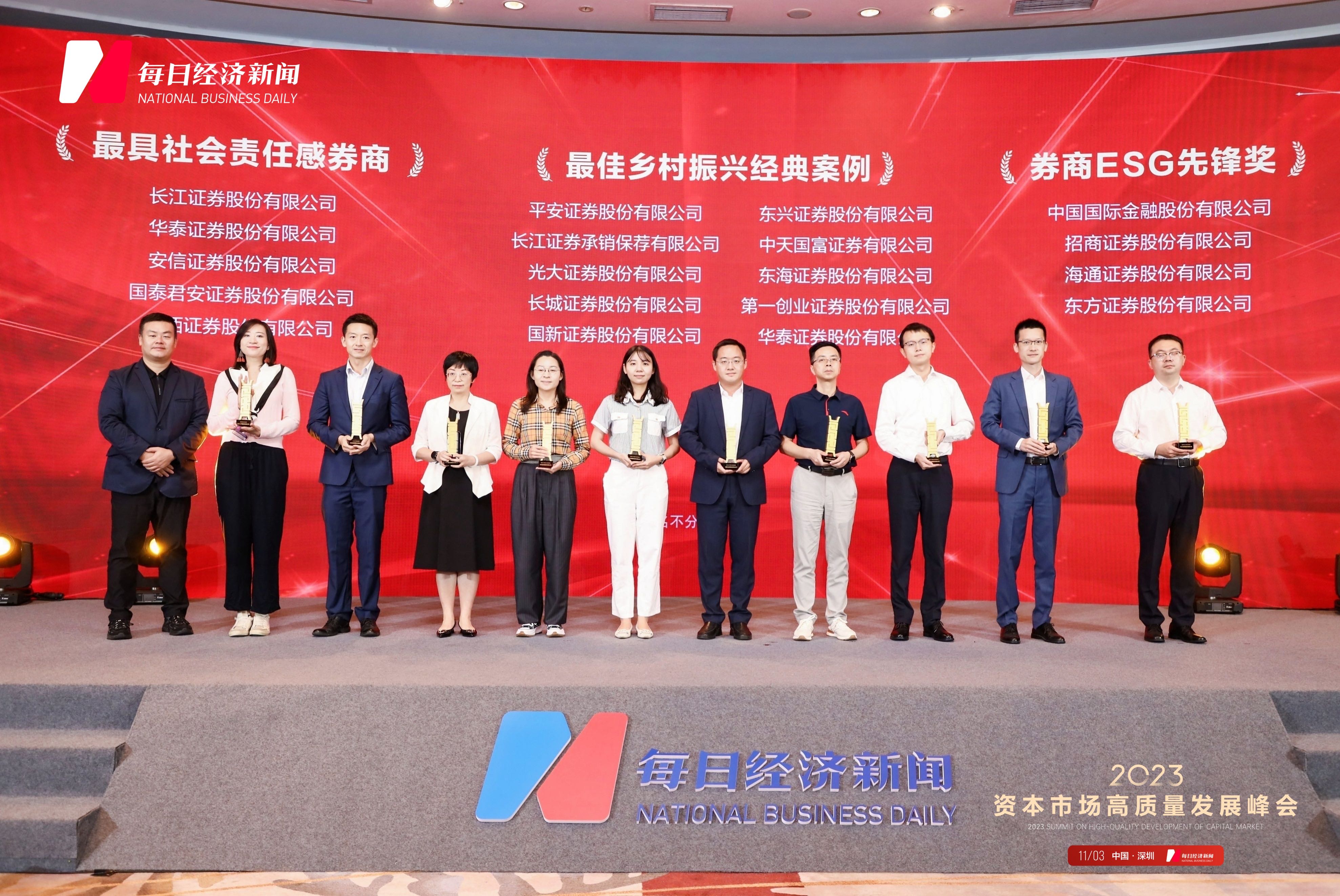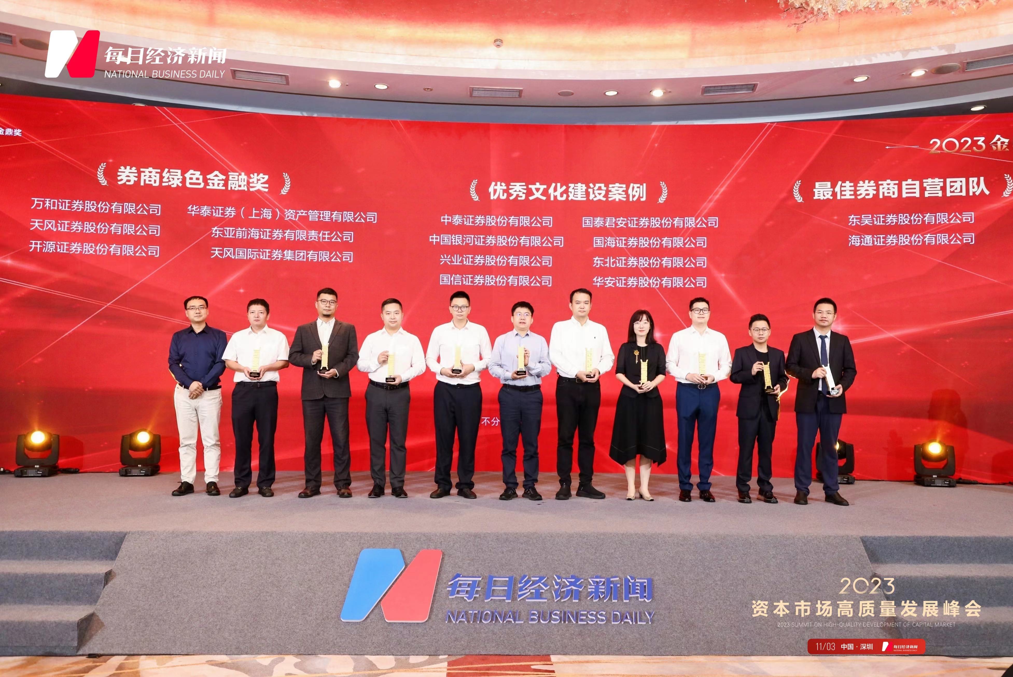 11月3日,由《每日经济新闻》主办的“2023资本市场高质量发展峰会暨金鼎奖颁奖盛典”在深圳举行。国泰君安凭借卓越的市场表现,荣登“2023中国证券业上市公司品牌价值榜”TOP2,同时荣获“最具金融科技实力券商”、“最具影响力托管券商”、“最具社会责任感券商”、“优秀文化建设案例”等多项大奖,子公司国泰君安资产管理荣获“最佳固收资管团队”大奖。