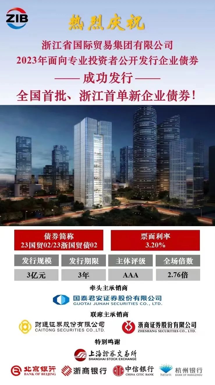 近日,浙江省国际贸易集团有限公司(简称“浙江国贸集团”)在上海证券交易所成功发行集团第二期优质主体企业债券——浙江省国际贸易集团有限公司2023年面向专业投资者公开发行企业债券,国泰君安担任本项目牵头主承销商。本期债券属企业债券发行审核职责划转过渡期后在交易所簿记发行的全国首批、浙江首单新企业债券,具有良好的示范效应。