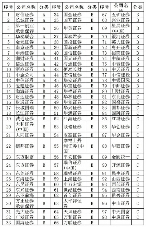 川财证券、东北证券、国盛证券、国融证券、国都证券、红塔证券、华创证券、华金证券、金圆统一、民生证券、甬兴证券、中天证券、中天国富、中原证券、山西证券、西部证券、开源证券、华西证券获评C类。
