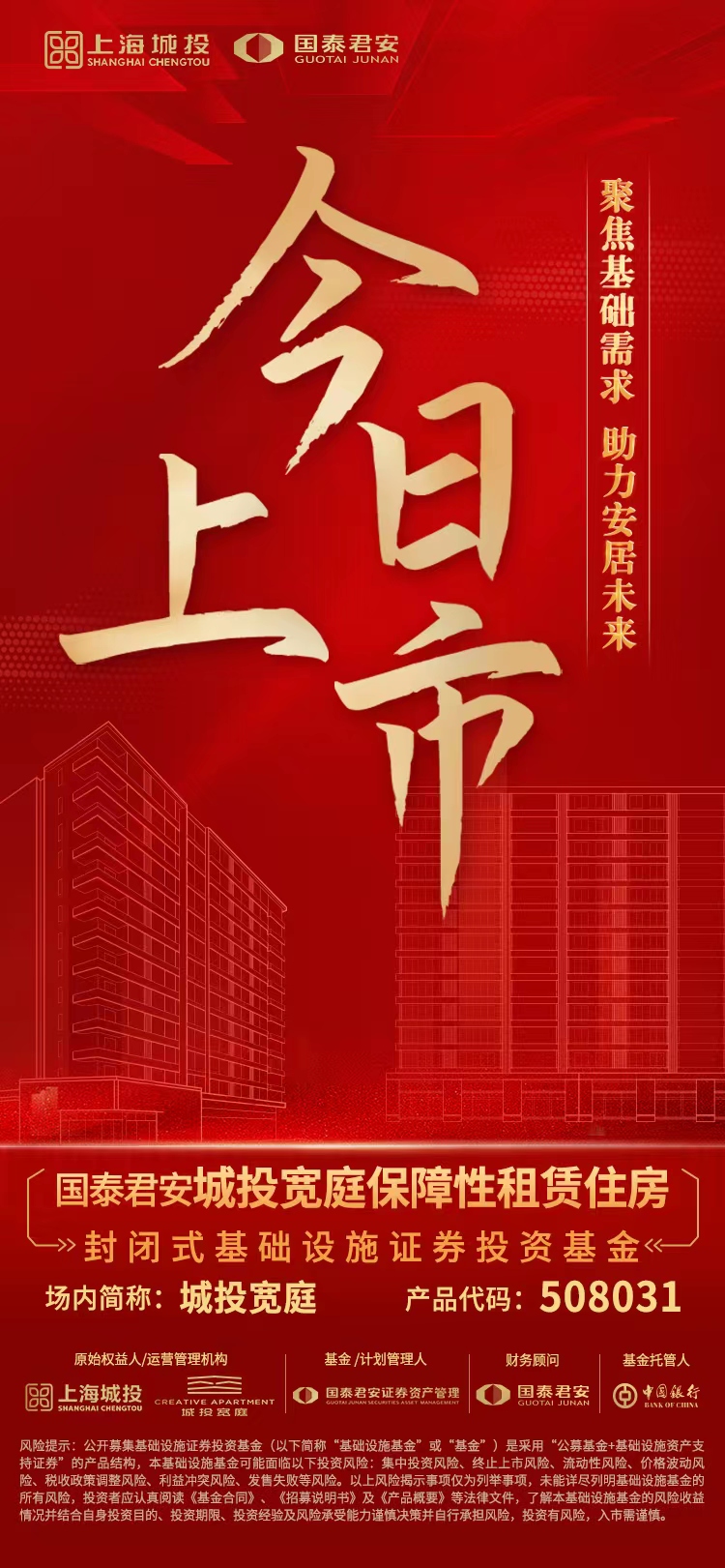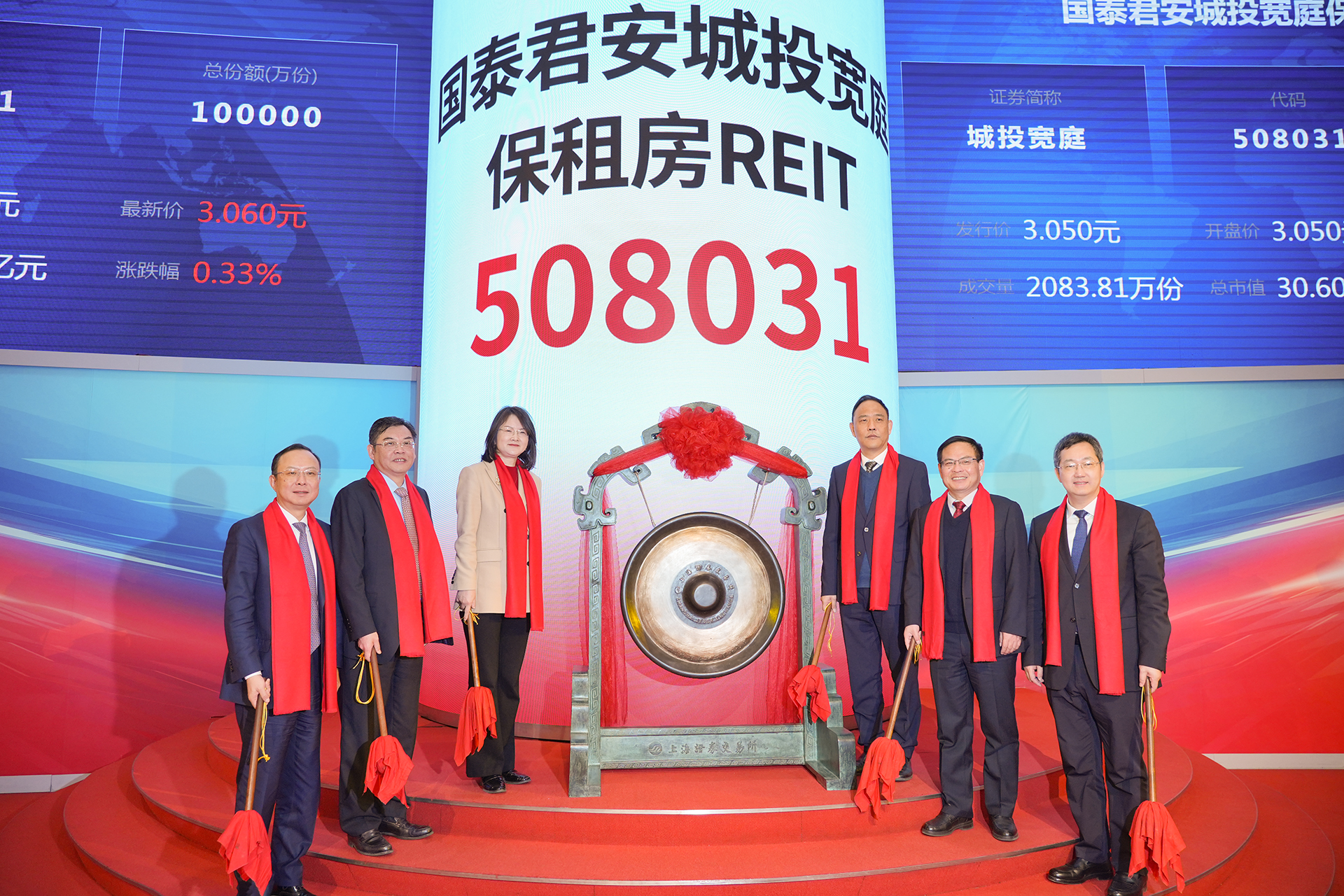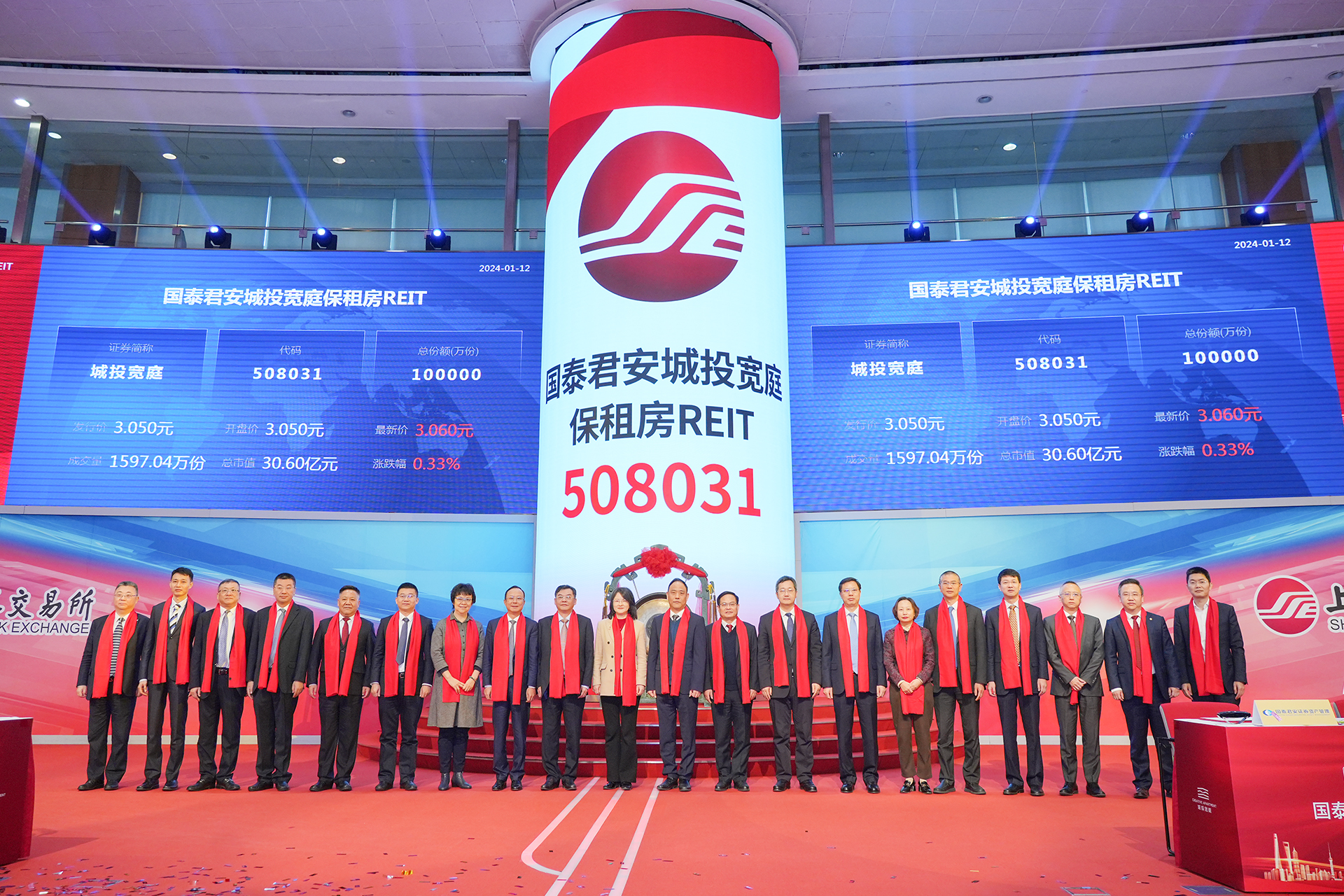 1月12日,由国泰君安资管作为基金管理人和资产支持证券管理人、国泰君安证券作为财务顾问的“国泰君安城投宽庭保障性租赁住房封闭式基础设施证券投资基金”(简称“国泰君安城投宽庭保租房REIT”)在上海证券交易所举行上市挂牌仪式。上海市发改委副主任陈石燕,上海市国资委副主任叶劲松,上海市杨浦区副区长施方,上海证券交易所副总经理吕昊,上海城投集团党委书记、董事长蒋曙杰,国泰君安证券党委书记、董事长朱健,中国银行上海市分行党委书记、行长张守川出席上市仪式。