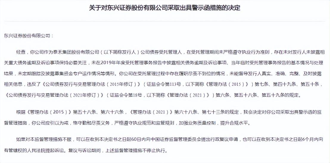 具体来看,东兴证券作为泰禾集团(发行人)债券受托管理人,在受托管理期间未严格遵守执业行为准则,存在未对发行人未披露相关重大债务逾期及诉讼事项保持必要关注,未在2019年年度受托管理事务报告中披露相关债务逾期及诉讼事项、当年临时受托管理事务报告的基本情况与处理结果,未定期跟踪及披露募集资金专户运作情况等违规情形,被证监会出具警示函。