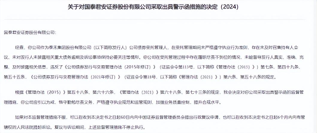 国泰君安证券作为泰禾集团(发行人)债券受托管理人,在受托管理期间未严格遵守执业行为准则,存在未及时召集持有人会议、未对发行人未披露相关重大债务逾期及诉讼事项保持必要关注等违规情形,被证监会出具警示函。