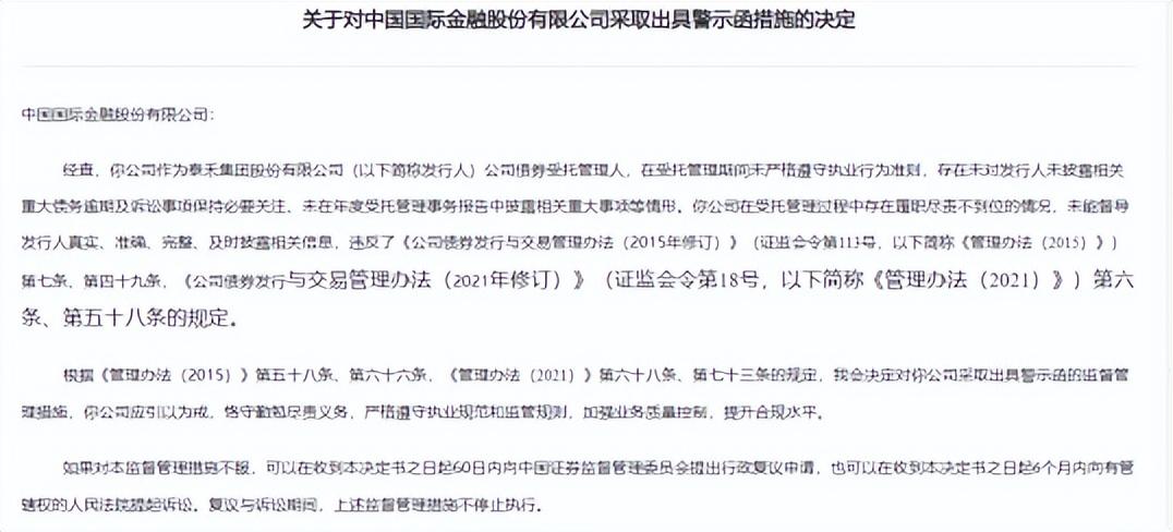 中金公司作为泰禾集团股份(发行人)债券受托管理人,在受托管理期间未严格遵守执业行为准则,存在未对发行人未披露相关重大债务逾期及诉讼事项保持必要关注、未在年度受托管理事务报告中披露相关重大事项等违规情形,被证监会出具警示函。