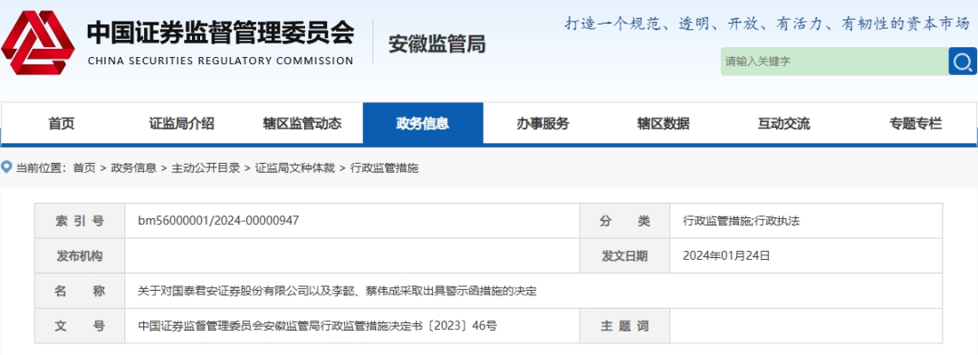 根据《证券发行上市保荐业务管理办法》(证监会令第170号)第六十五条相关规定,我局决定对国泰君安、李懿、蔡伟成采取出具警示函的行政监管措施,并记入证券期货市场诚信档案。国泰君安、李懿、蔡伟成应加强相关法律法规学习,不断提升执业质量。